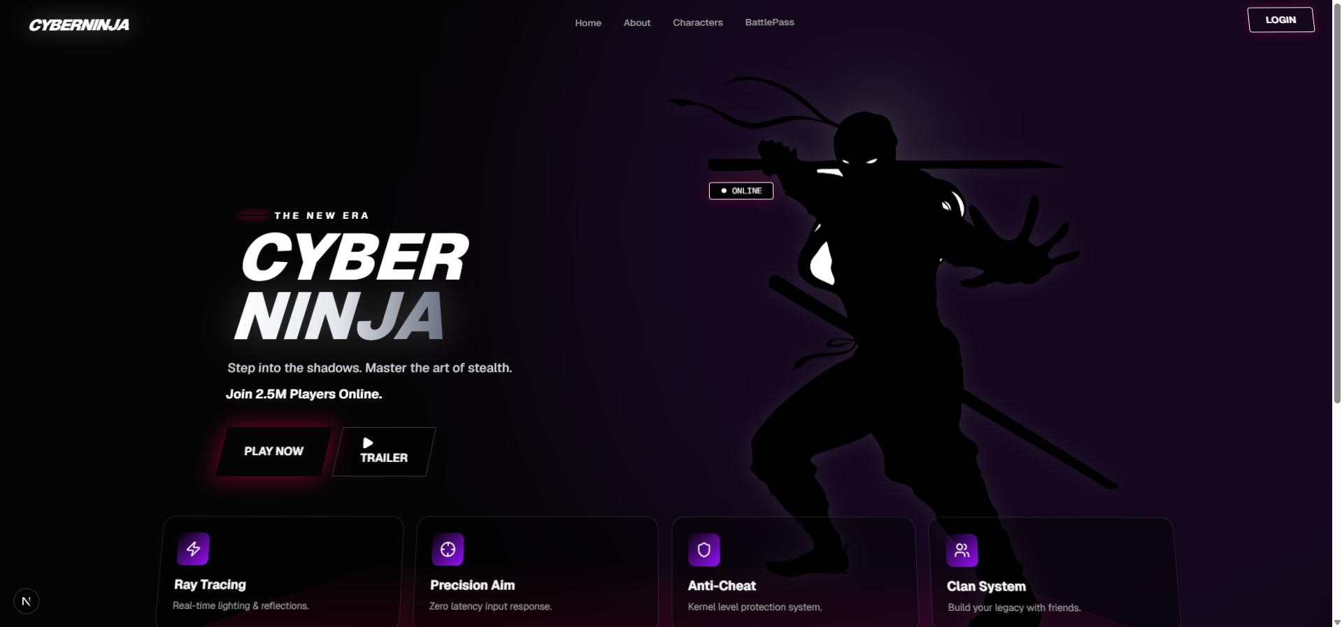 A high-performance gaming landing page featuring mouse-parallax effects, 3D character tilting, and a futuristic neon aesthetic.