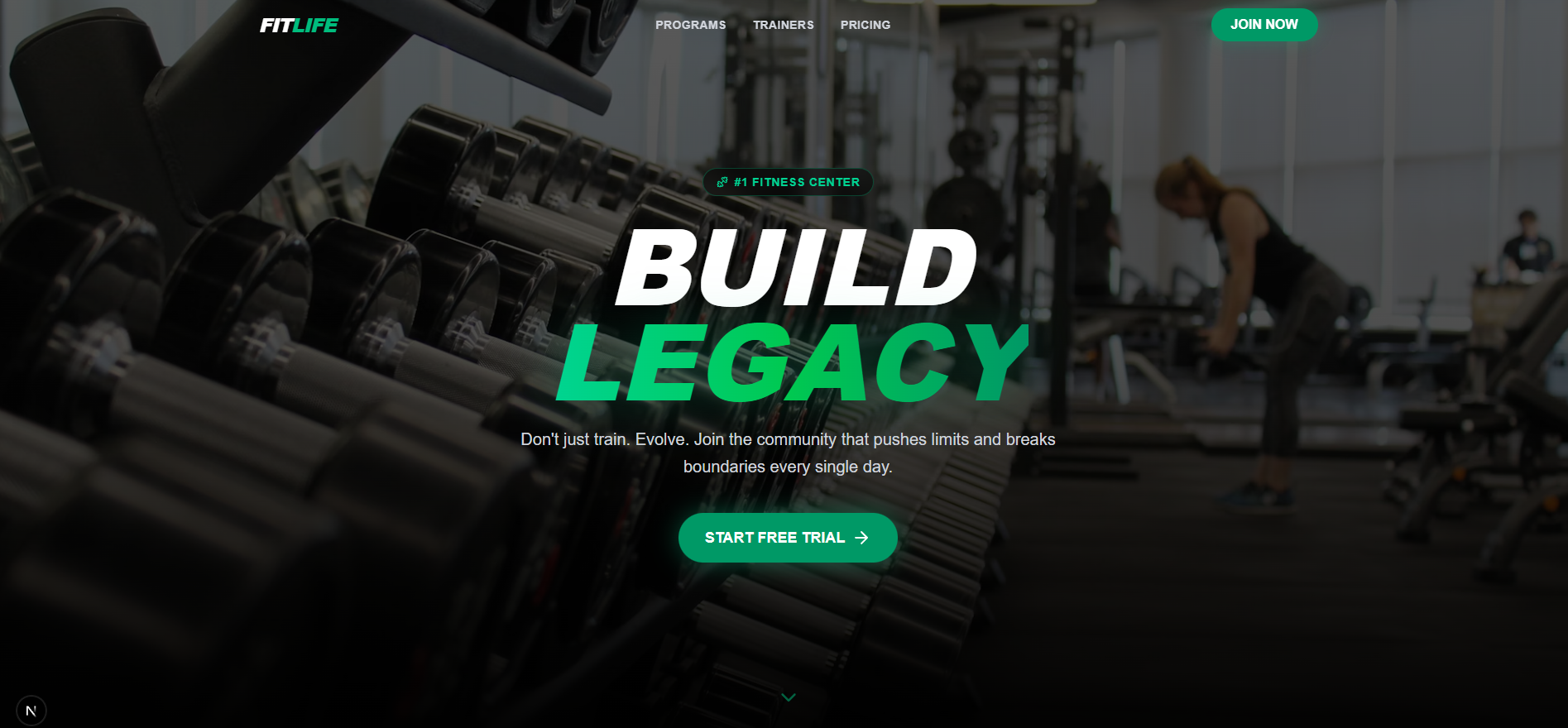 Modern gym membership landing page with pricing tables, trainer profiles, and a booking system integrated with Calendar API.